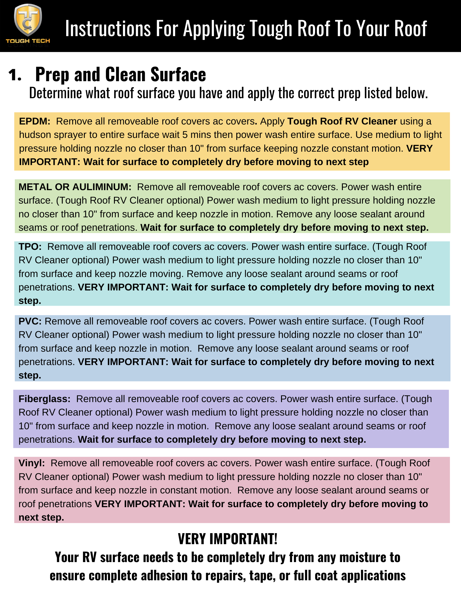 Tough Roof RV needs to be applied to with 2 coats . You should apply in thin layers up to 8 mils wet thick for first coat and second coat at 24 mils wait approximately 2 hours between coats.