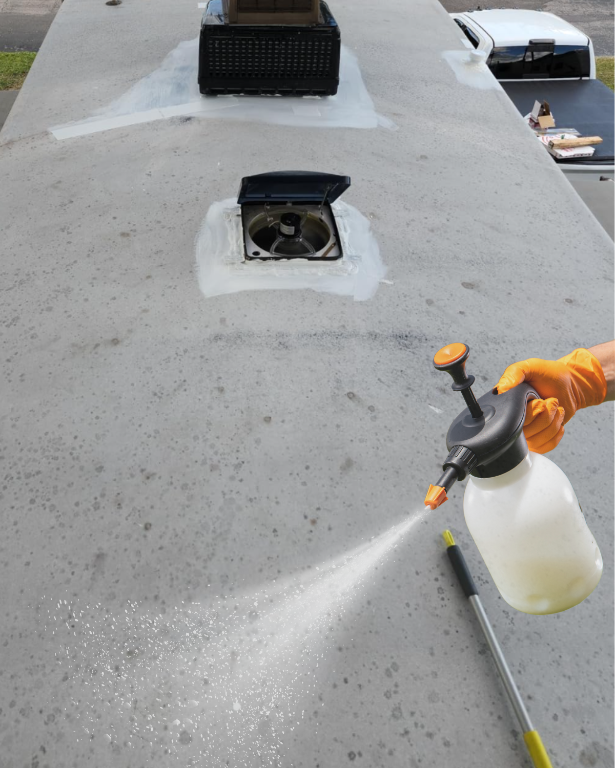 Power wash and clean surface with soap and water. Tape off all areas that you do not want to get Tough Roof RV on such as vents, ac units using painters tape. Remove all loose sealant around all penetrations. Make sure your entire surface is clean and dry before proceeding to the next step( NOTE: Do not apply Tough Roof over old roof coatings like silicone or acrylics) Tough Roof RV is a professional grade liquid rubber and should be applied to the original surface membrane.
